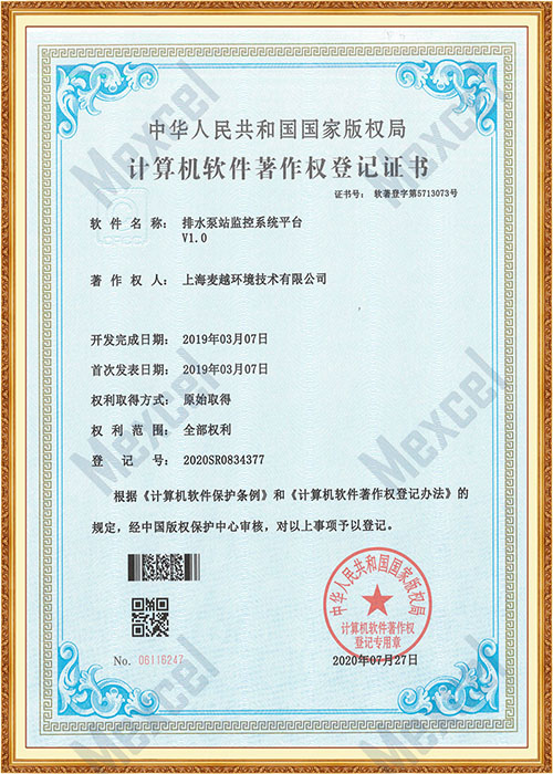 •  排水泵站監(jiān)控系統(tǒng)平臺(tái)著作權(quán)證書(shū)